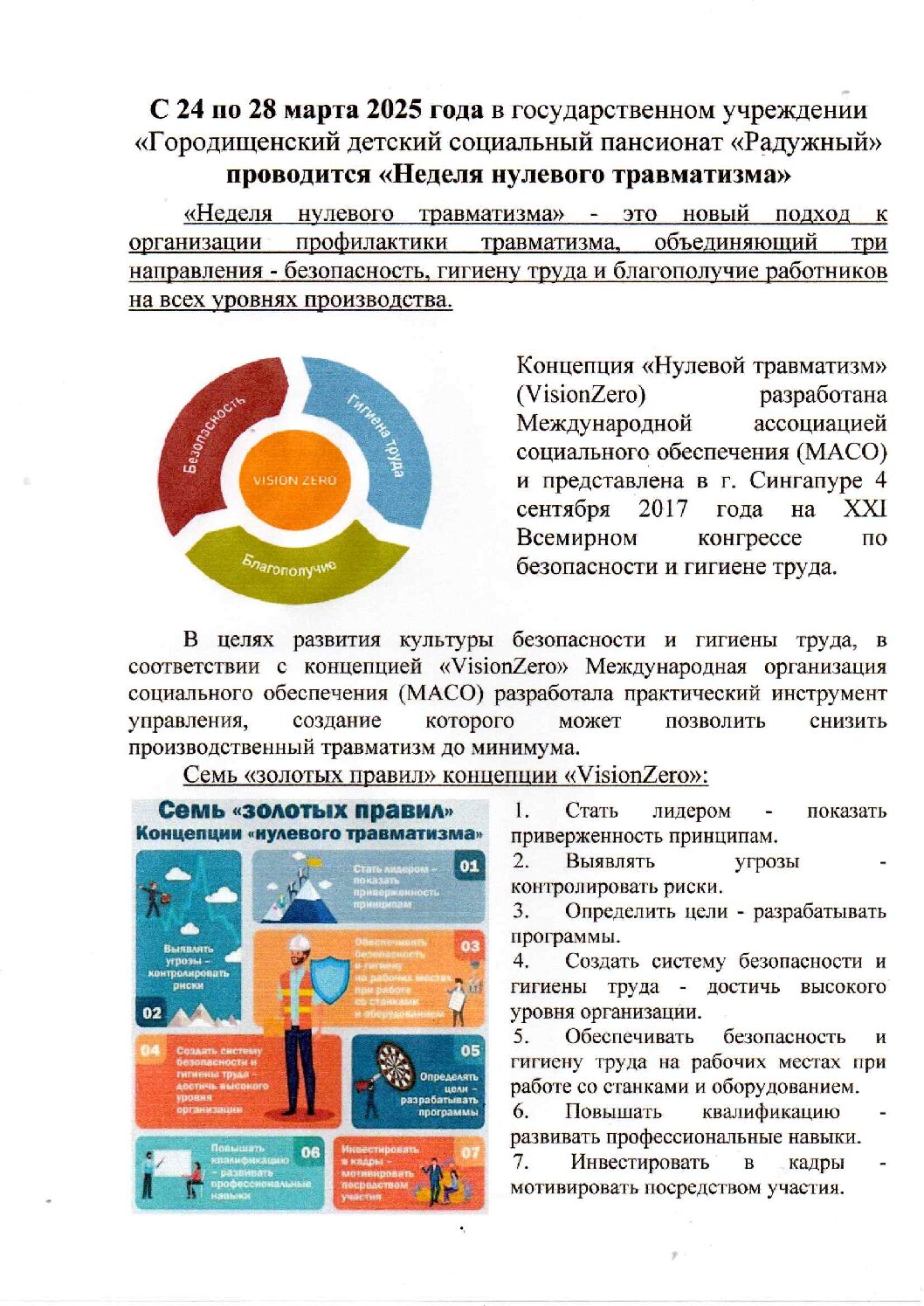 С 24 по 28 марта 2025 года в Государственном учреждении “Городищенский детский социальный пансионат “Радужный” проводится “Неделя нулевого травматизма”.